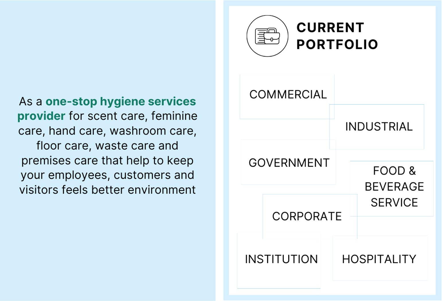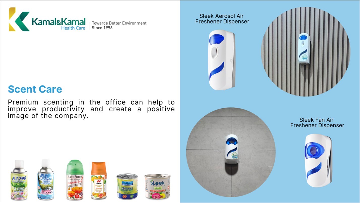 As a one-stop hygiene services provider for scent care, feminine care, hand care, washroom care, floor care, waste care and premises care that help to keep your employees, customers and visitors feels better environment.